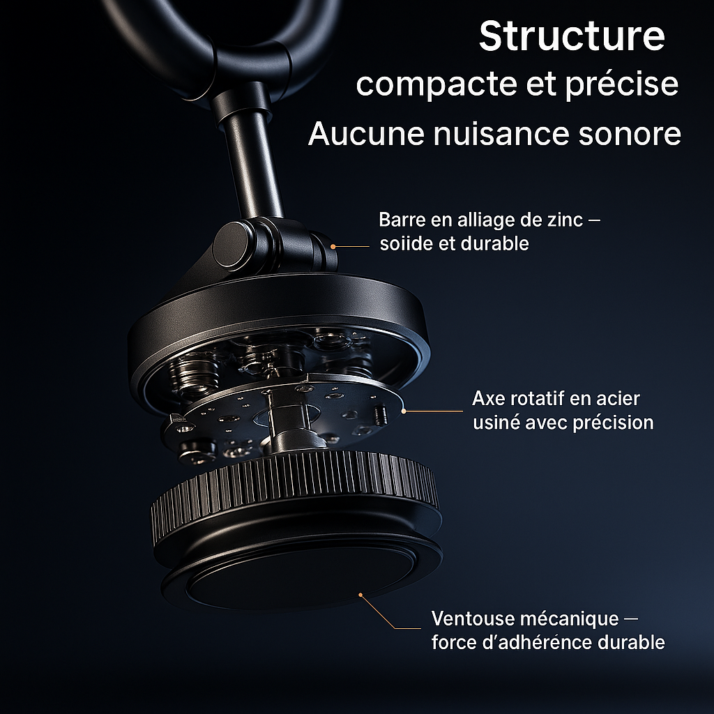 Non, axe inox anti-desserrage garantit rotation silencieuse.